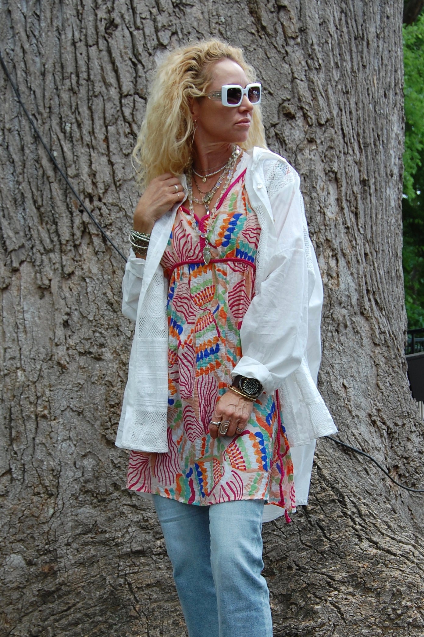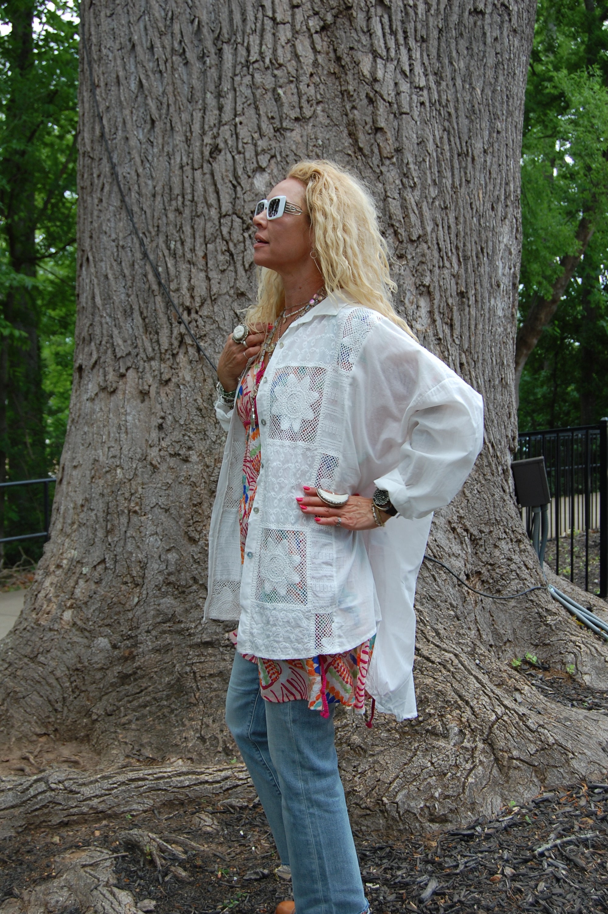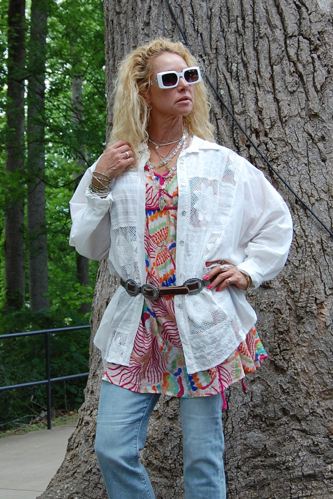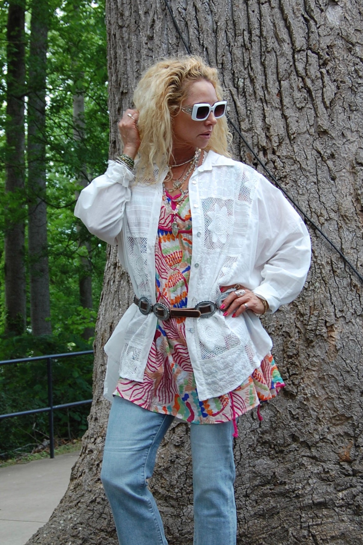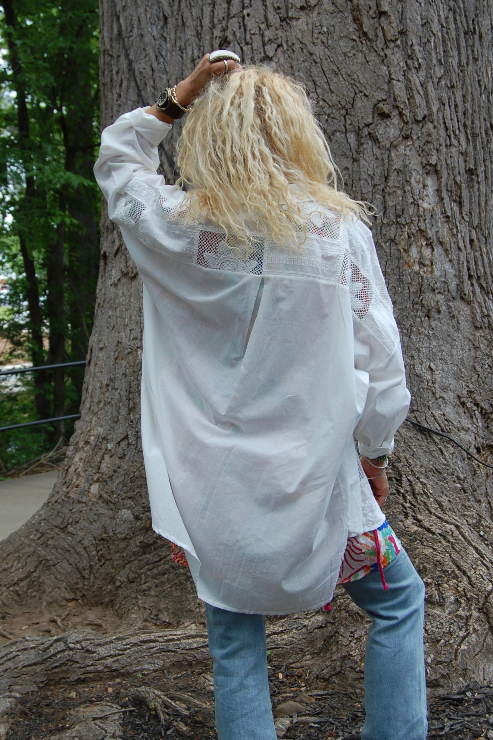 This Cassie Crochet Button Up in White's contents contain 100% Cotton material. Total body length (shoulder to bottom) measures to 33 inches.