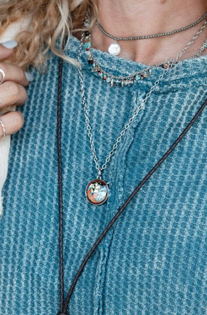 A hand resined medium circle reversible pendant featuring the owner, Spirit's, own personal artwork, and inspiring quote on reverse side.