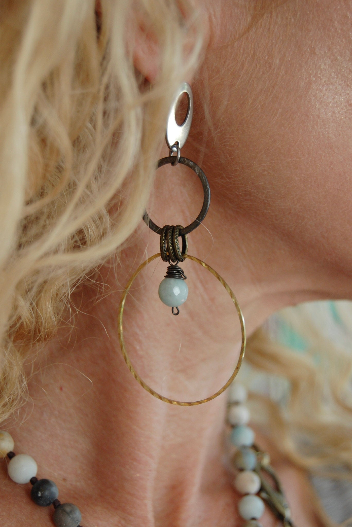 Our Spirit Lala Boho: Oval Top Silver & Gold 2 Circle Earrings in Prehnite feature: