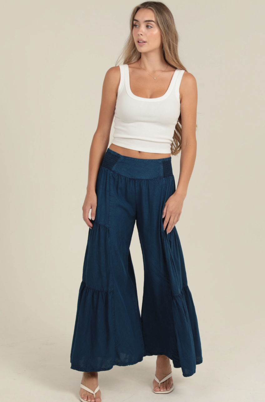 These V Yoke Waist Pants in Denim are the perfect stylish bottoms to add to your closet, and or any on-trend bohemian style outfit! Accompany wide legs and flowy material. These pants give any look a stylish touch!
