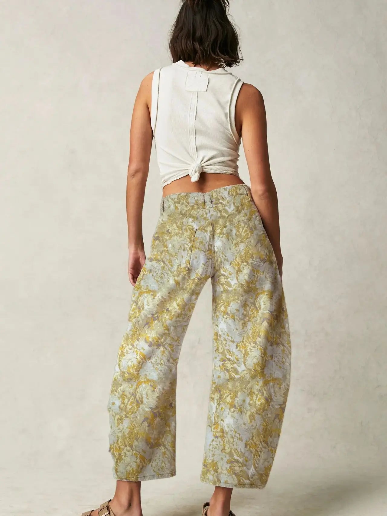 To maintain quality, these Relaxed Fit Graphic Print Denim Jeans In Flower are best when hand or machine washed with cold water, with like colors, and hung or laid out to dry!