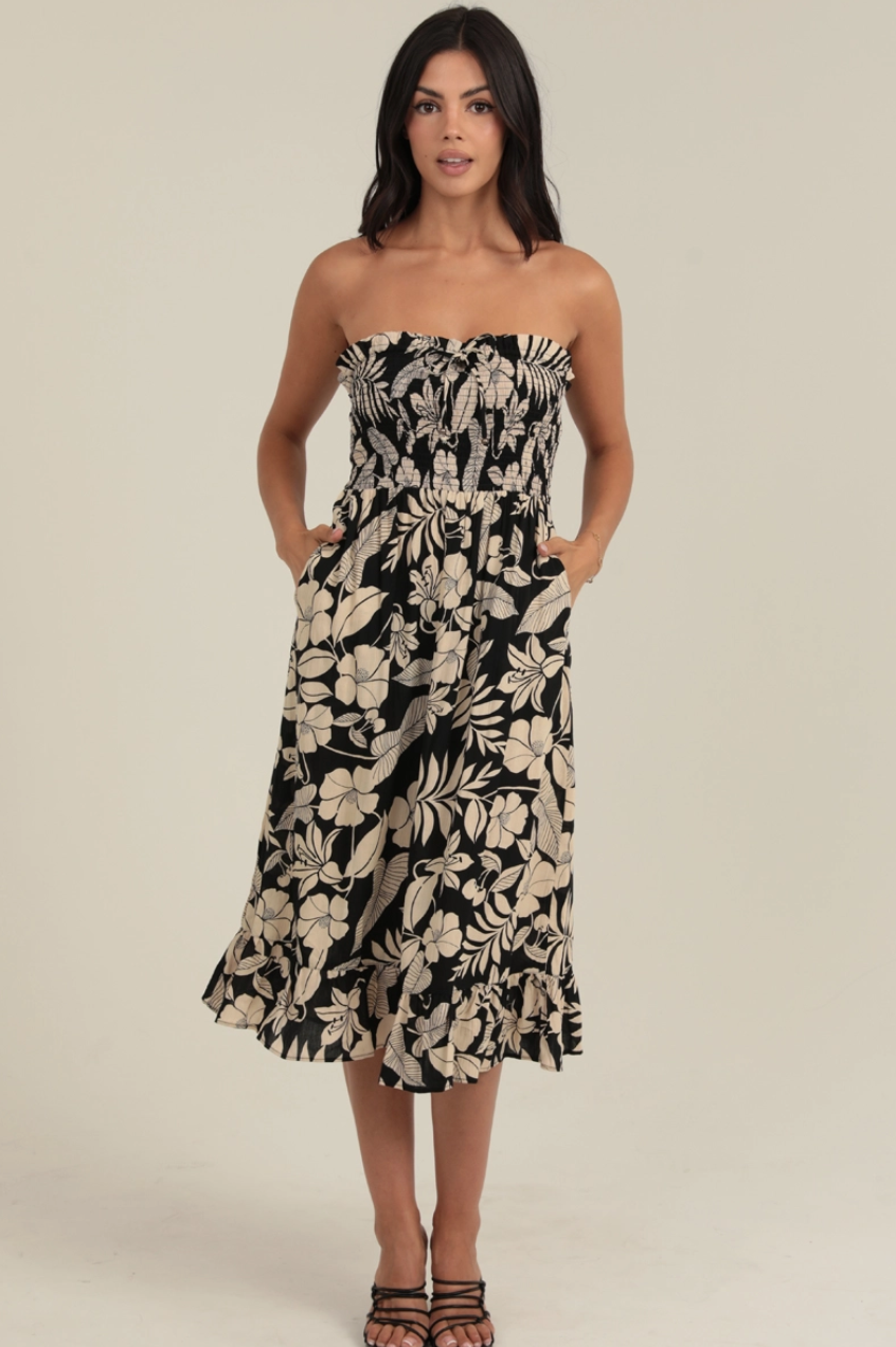 The Molly Strapless Midi Dress in Black & White will be your favorite wardrobe staple! The dress is strapless and features side pockets. Paired with flats or heels, it's an elegant option for day or evening.