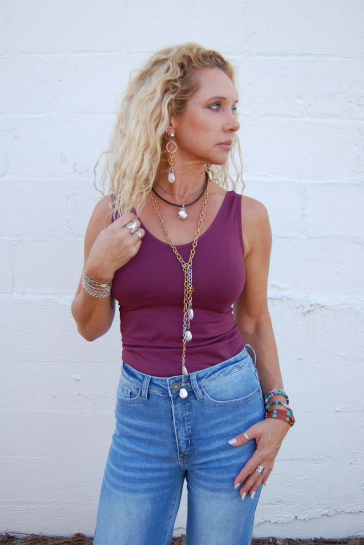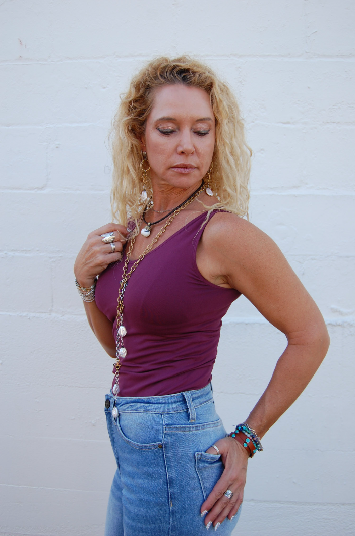 • This UV Fall Core Tank in Plum is the perfect stylish basic to add to your closet, and or any on-trend bohemian style outfit! Features a reversible u-neckline on both the front and the backside, you can pair this tank under any kimono, cardigan, jacket, dress, or low-cut top! It's designed for durability, providing an ideal combination of comfort, stretch, and breathability.