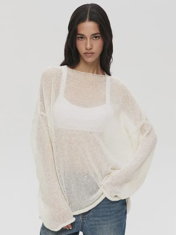 Hollow Knit Bell Sleeve Sweater For Women In Beige