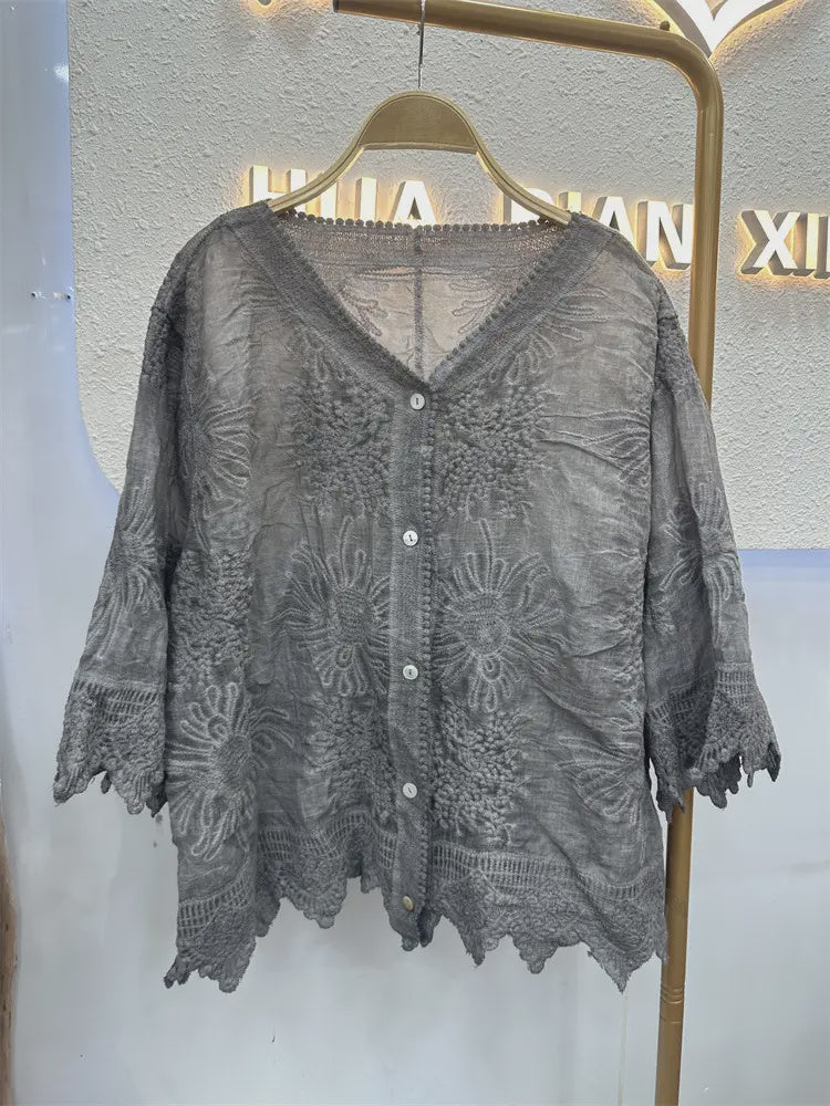 This Lace Patchwork Embroidered Blouse In Gray contains 100% Cotton material.