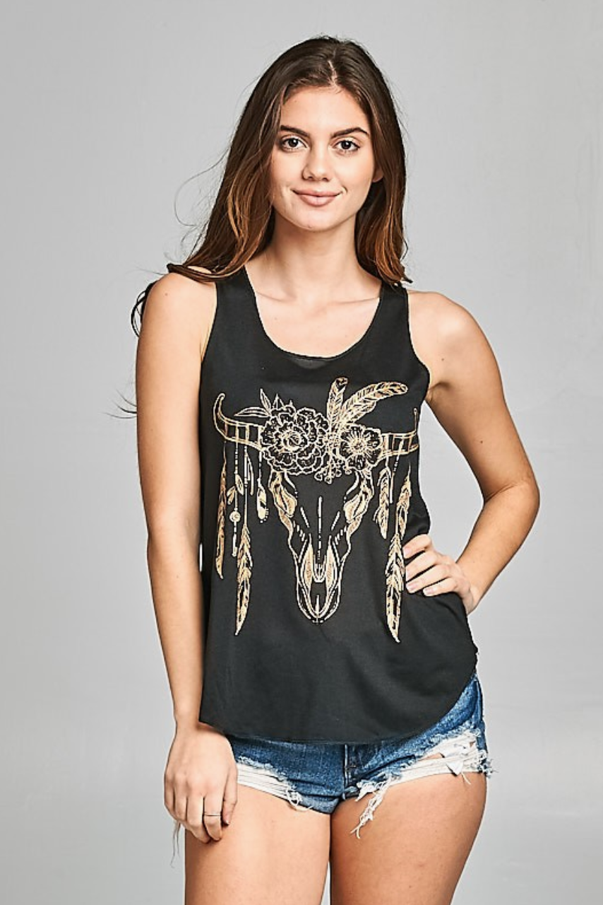 Boho Bull Graphic Tank Top in Black