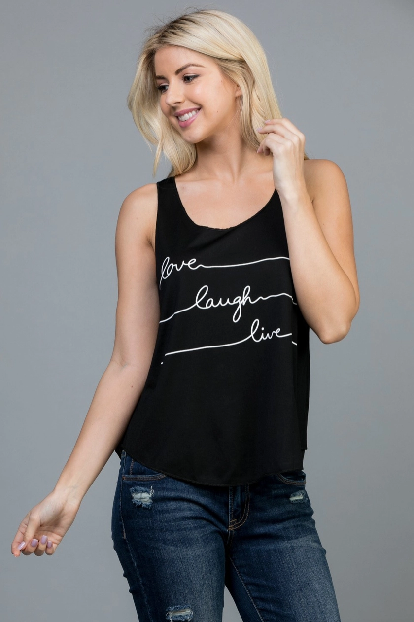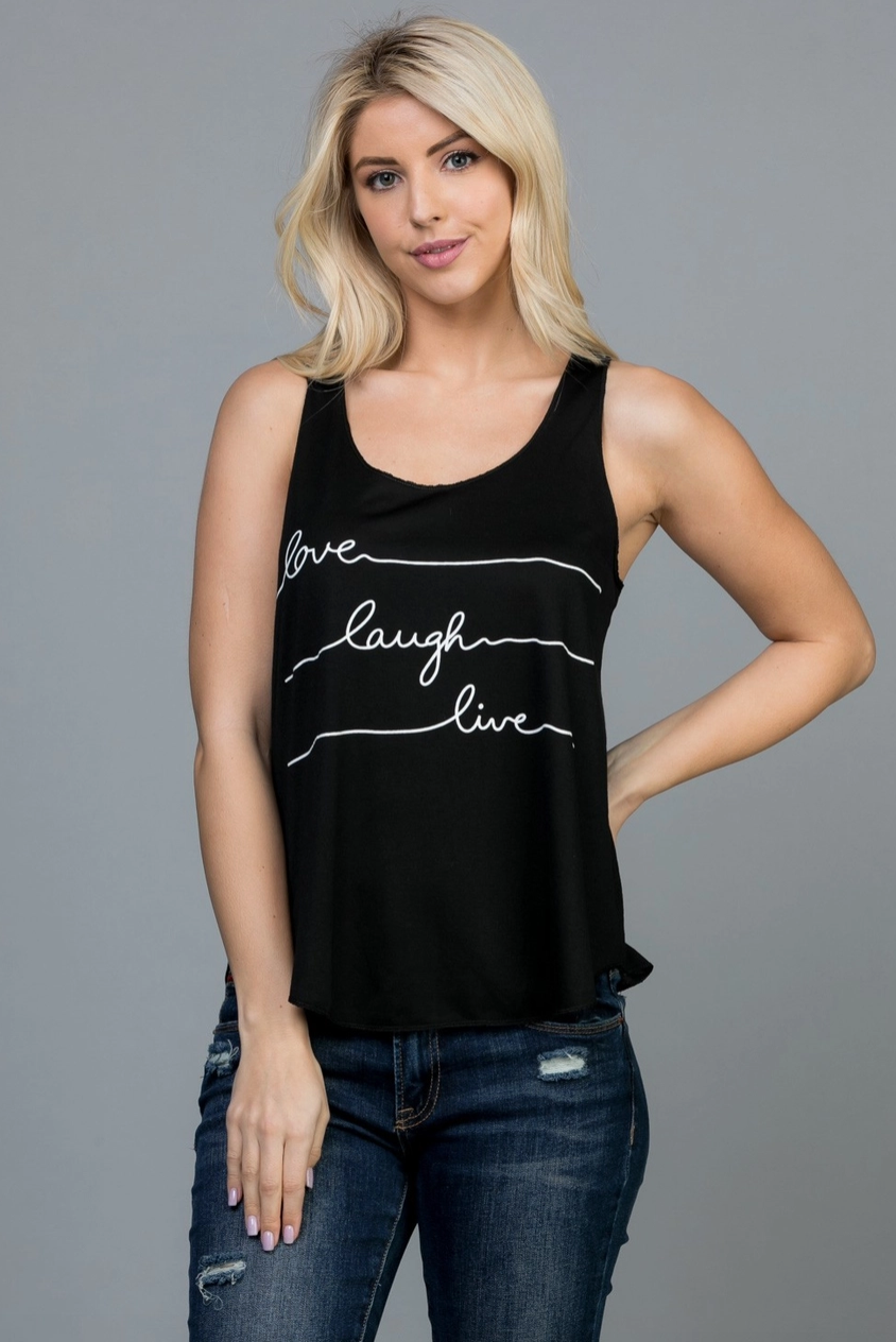 • This Live, Laugh, Love Graphic Tank Top in Black is the perfect stylish basic to add to your closet, and or any on-trend bohemian style outfit! Giving you a light breathable fit, with a trendy live, laugh, love graphic print, you can pair this tank under any kimono, cardigan, jacket, dress, or low-cut top! It's designed for durability, providing an ideal combination of comfort, stretch, and breathability.