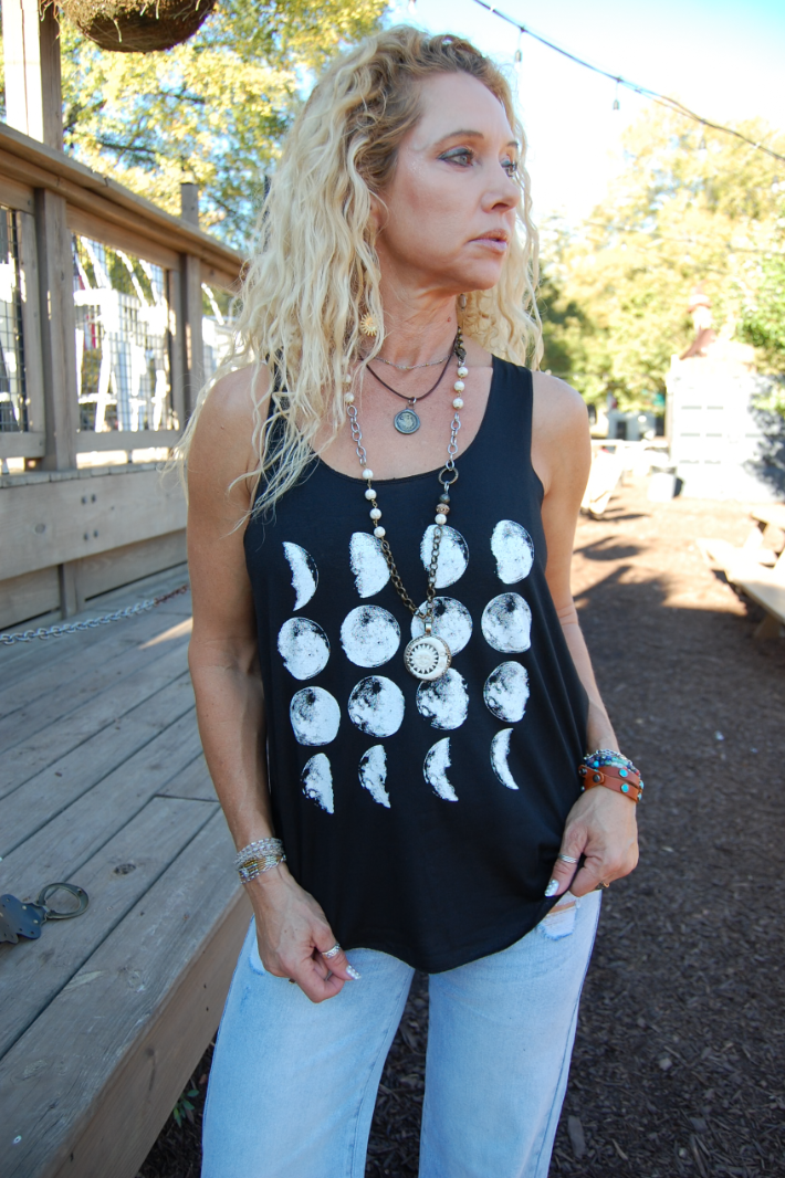 • This Moon Phases Tank in Black is the perfect stylish basic to add to your closet, and or any on-trend bohemian style outfit! Giving you a light breathable fit, with a trendy moon phase print, you can pair this tank under any kimono, cardigan, jacket, dress, or low-cut top! It's designed for durability, providing an ideal combination of comfort, stretch, and breathability.